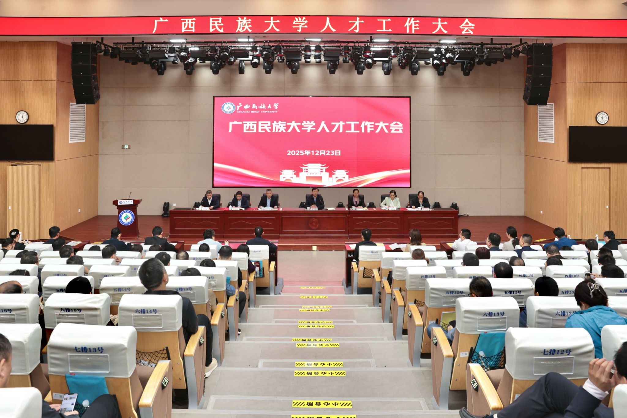 12月23日,广西民族大学在相思湖校区文化研习基地召开人才工作大会,本次大会以“聚智赋能 激发活力”为主题,总结2018年以来学校人才工作取得的成绩与经验,规划部署未来五年学校人才工作的战略目标、重点任务和关键举措。校党委书记唐平秋、校长韦仕珍等在家校领导及老领导出席会议,获奖代表、职能部门及各教学科研单位代表参会,党委常委、副校长吕俊彪主持会议。